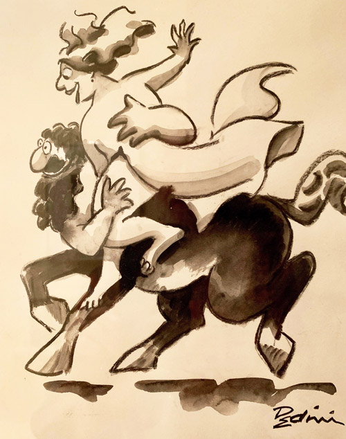I requested of him an original cartoon to be featured in each publication. He said he wasn't really interested. He was too busy providing work to New Yorker, Esquire and Playboy magazines. However, following another coffee, some further discussion about my life, my interest in educating our readers about food and wine and a promise to feature his cartoons as a full-page feature called, 'Cordially Yours,' ( Note: he had never been offered by any publication a full page to feature his cartoons) he presented me a gift of a cartoon he had sketched of a centaur (half horse-half man) carrying a woman on his back, jokingly commenting the caption, "Hey, You're Really Fit For An Old Man."