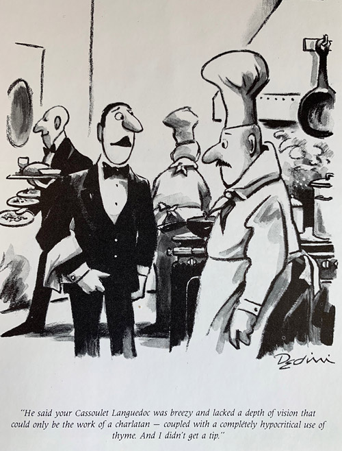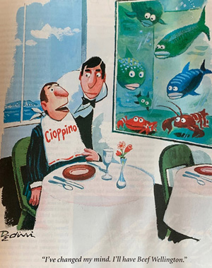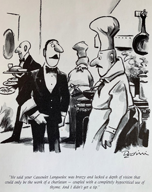 He agreed to provide me a cartoon for each edition of the magazine. However, he was not sure if he could come up with a cartoon that would carry a theme of dining, but he would try. Every three months I would meet him in his studio. He would show me several ideas he sketched out and he asked me to select the one I liked.