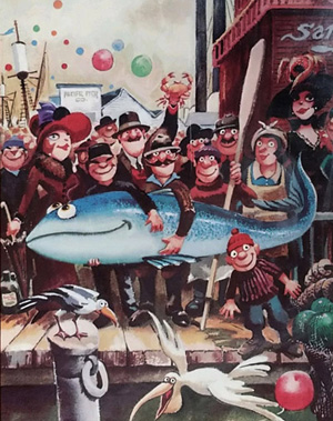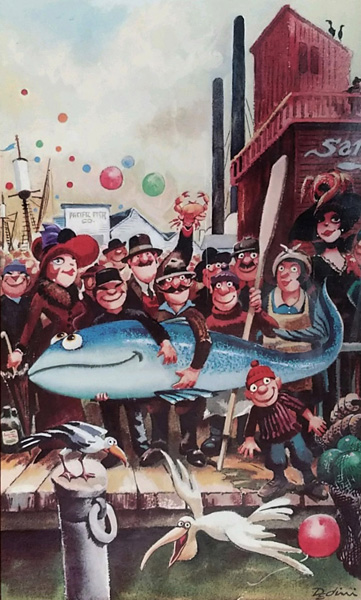 I reviewed the preliminary sketches for the poster in Dedini's studio and the kid in the foreground was his interpretation of my eldest son, Leif, who I had described to him earlier. The personalities characterized in the painting were a wide variety of the people from Cannery Row.