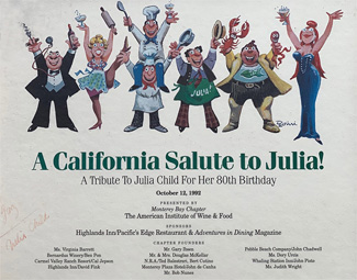 Over the years he also generously accepted my request to come up with an illustration for Julia Child's 80th Birthday Celebration and a poster for 'The Great Cannery Row Reunion,' held in 1983. The last being a project of particular interest to Dedini because he was one of the few remaining members of the Doc Ricketts' Lab "Men's Group." Doc Ricketts' Lab, on Cannery Row, was once the laboratory and home of scientist, Ed Ricketts, made famous by John Steinbeck. (The two became friends while living in Pacific Grove and Steinbeck worked for a bit in the lab examining marine specimens and discussing philosophy with Ricketts.) I was fortunate to have been invited several times by former owner/member, Frank Wright, to join the members of Doc Ricketts' Lab "Men's Group" for socializing, wine, classical music and often philosophical conversations. These gatherings eventually spawned the idea for what would eventually become the Monterey Jazz Festival.