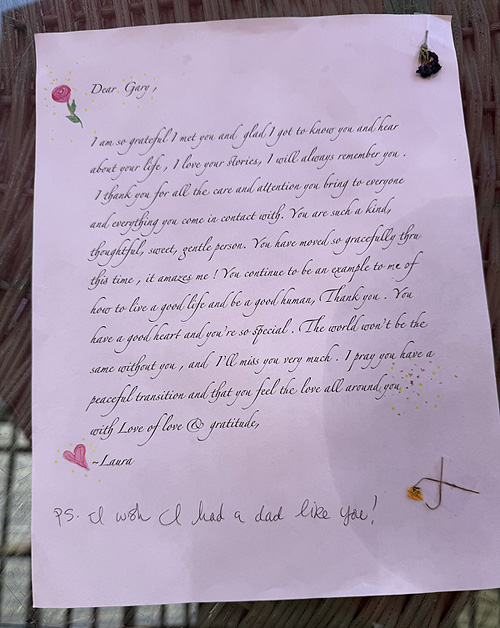 I thank you for all the care and attention you bring to everyone and everything you come in contact with. You are such a kind, thoughtful, sweet, gentle person. You have moved so gracefully thru this time, it amazes me! You continue to be an example to me of how to live a good life and be a good human, Thank you. You have a good heart and your're so special. The world won't be the same without you, and I'll miss you very much. I pray you have a peaceful transition and that you feel the love all around you.